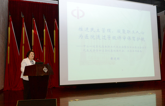 随后,医院党委副书记、工会主席黄建明作了题为《推进民主管理 凝聚职工人心为医院通过等级评审保驾护航》的报告。报告回顾了2014年医院教代会和工会工作,黄书记指出,在过去一年中,医院工会紧紧围绕“创建国家区域医疗中心”的工作主线,按照“党政所谋、职工所需、工会所能”的要求,在推动民主管理、促进医院和谐发展、加强自身建设等方面做了切实而有效的工作。接下来,医院教代会将进一步发挥职能和作用,助力医院创建国家区域医疗中心。