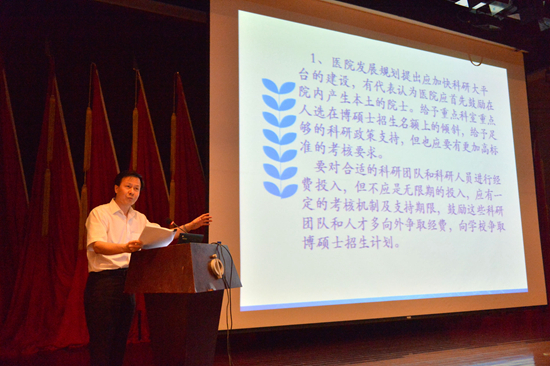 会上,肖海鹏院长向大会作了题为《抢抓工作机遇、争创一流进前五,为创建国家级区域医疗中心而不懈奋斗》的工作报告。报告包括医疗管理、教学改革、学科建设、科学管理、院区发展、医院形象等,并就下一阶段筹建国家重点实验室等重点工作提出了今年的工作计划。肖院长在会上感谢全院职工对医院发展所做出的贡献,希望大家在医院深化医疗改革、提升医疗服务的关键阶段,团结一致,抢抓机遇强特色,争创一流进前五,为最终实现“建设百姓满意、信赖,职工自豪、幸福,国内一流、国际知名的国家区域医疗中心”的长远目标而不懈奋斗!