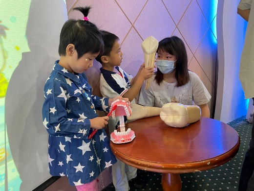紧接着来自医志医声学术科普协会的同学从各个方面为大家进行的医学常识科普。首先是尹福玲同学为大家介绍人体运动系统中的骨骼,讲解人体骨骼组成以及相关趣味知识。贾春艳同学为大家讲解人体里的重要器官,带领大家一同认识各个器官的外观与功能。在讲解期间配合着模型进行教学,颇有成效。最后由吴嘉美同学为大家简单介绍了牙齿的基本知识以及护理方法,带领大家学习了正确的刷牙方法,让大家都认识到了口腔健康的重要性。