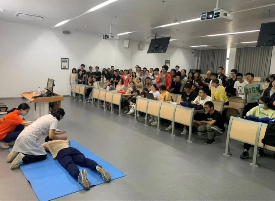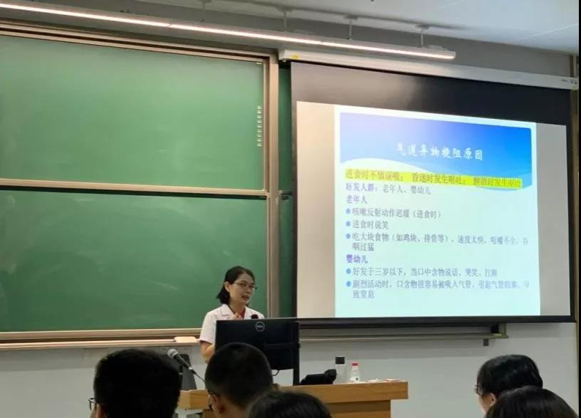 培训初始,主讲人护理学院内科教研室赵娟娟副教授向大家描述了常见的突发紧急状况,如:晕厥、气道异物梗阻、癫痫、溺水、卒中急性发作、心脏骤停等,解释了突发紧急状况的原因和特征,通过视频演示了正确的现场急救处理方法:如何正确进行院外心肺复苏、如何正确使用除颤仪等。在讲解过程中,赵娟娟副教授以视频的形式穿插真实案例,既生动又形象,牢牢抓住了现场师生的注意力。