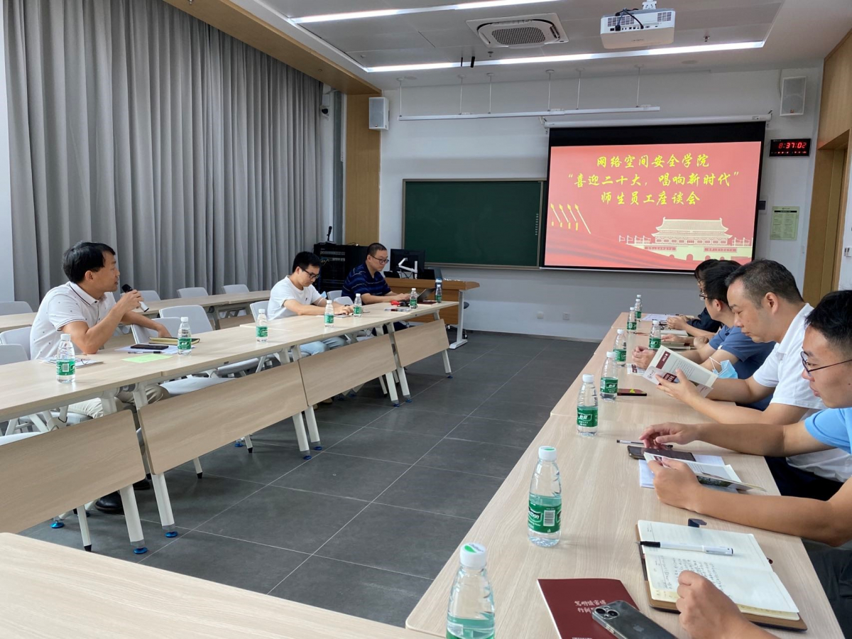 2022年9月27日下午,网络空间安全学院全体教职员工在深圳校区西教学楼1栋604齐聚一堂,召开以“喜迎二十大,唱响新时代”为主题的教师座谈会。