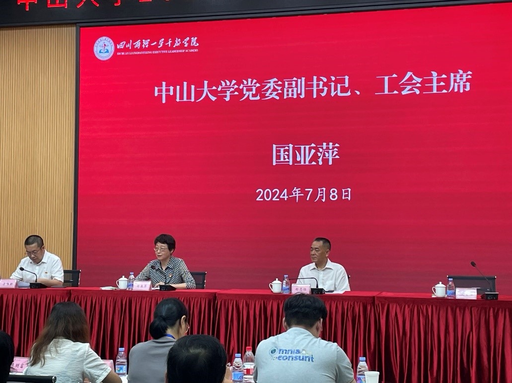 中山大学党委副书记、工会主席国亚萍作总结讲话。她首先感谢绵阳市委市政府对中山大学的支持和帮助,感谢两弹一星干部学院对本次培训班的顺利举行所付出的心血。国亚萍副书记肯定了培训班的成效,认为培训内容充实丰富、形式多样,学员们学有所思、学有所悟、学有所获。她介绍了近两年学校工会在聚焦教职工最迫切的需求,不断提升教职工的获得感、幸福感,增强学校凝聚力、向心力等方面的工作和成效,通报了学校百年校庆活动的安排和部署。
