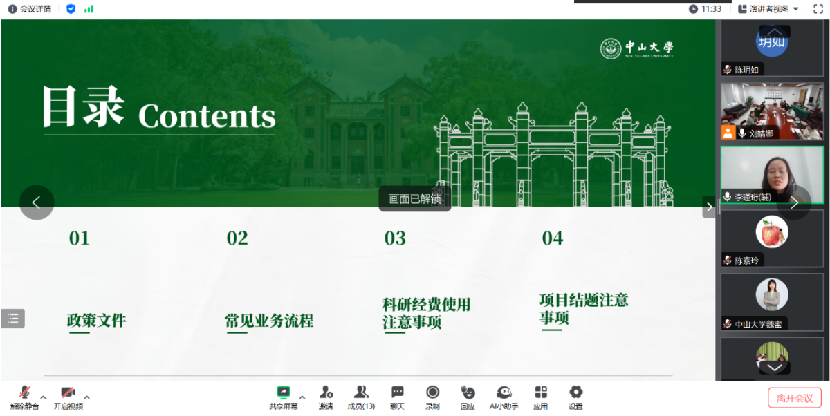 首先,财务处李瑾珩副处长详细讲解了关于科研项目资金管理的上级主管部门最新政策文件与学校制度,结合科研经费的申请、管理使用、报账流程,重点强调了项目资金使用的合规性、真实性、合理性和相关性;就科研经费使用可能存在的问题做了警示提醒,就学院工会预先征集的相关问题,做了回应解答。