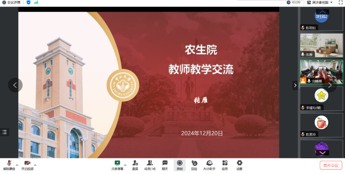 为了深入贯彻习近平总书记致中山大学百年校庆贺信精神和学校秋季工作会议精神,进一步提升学院治理体系和治理能力,促进新教师和党外教工的融入与成长,2024年12月20日,农业与生物技术学院举行了新教师工作交流暨非党员教职工午餐联谊活动。此次活动邀请了2024年新入职的7位教师、11位博士后,以及部分入职一年以上的教师、党政教辅人员,共40多人以线上与线下结合的方式参加了活动。活动由学院工会和党政办共同承办,工会主席朱冠恒副教授主持座谈交流。
