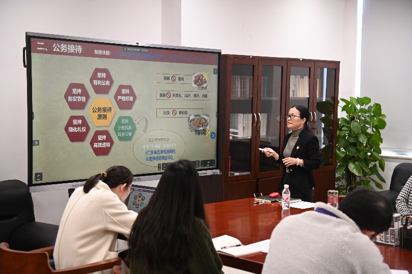 党政办李秀花主任宣讲了公务接待制度及讲座申报流程,强调规范的行政流程不仅能提高工作效率,还能保障学院资源的合理分配和使用,推动学院各项工作的顺利开展。