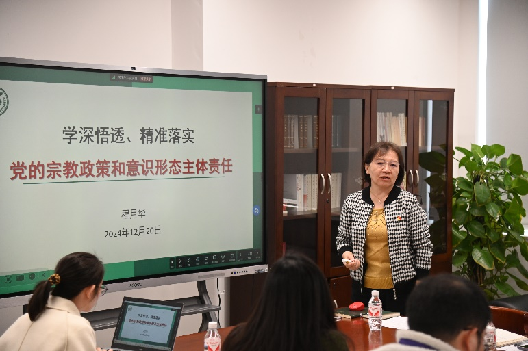程月华书记概要解读了党的宗教政策与意识形态主体责任,强调大家作为高校教师,必须坚守意识形态的正确立场,严格遵守国家法律法规和宗教政策,牢记立德树人使命,守好意识形态阵地,特别要提升知网、懂网、管网、用网的认识能力及素养,使互联网这个“最大变量”转化成事业发展的“最大增量”。