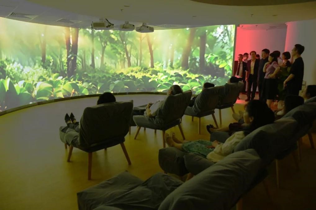 “幸福空间”采用多项创新技术,其弧幕墙构件主体为专利产品,即防火防水隔音的轻质ALC板。空间内运用了独有专利技术将天然沉香研制成可控香气的无火香薰颗粒,营造自然芬芳;使用AI音疗,透过AI电子音乐技术交互实现渐进式疗愈。同时,空间通过人工智能技术生成沉浸式数字艺术疗愈影像与音乐,虚拟现实(VR)与沉浸式投影技术相结合,并融入心理学和中医理论,全方位缓解压力、提升心理健康,努力实现身心的深度疗愈。此外,“幸福空间”还配备了“森呼吸”空气净化系统,引入了“魔力泥”,能释放高浓度负离子,可以媲美森林瀑布的清新纯净,让每一位职工仿佛穿越至自然深处,享受身心愉悦的清新之旅。