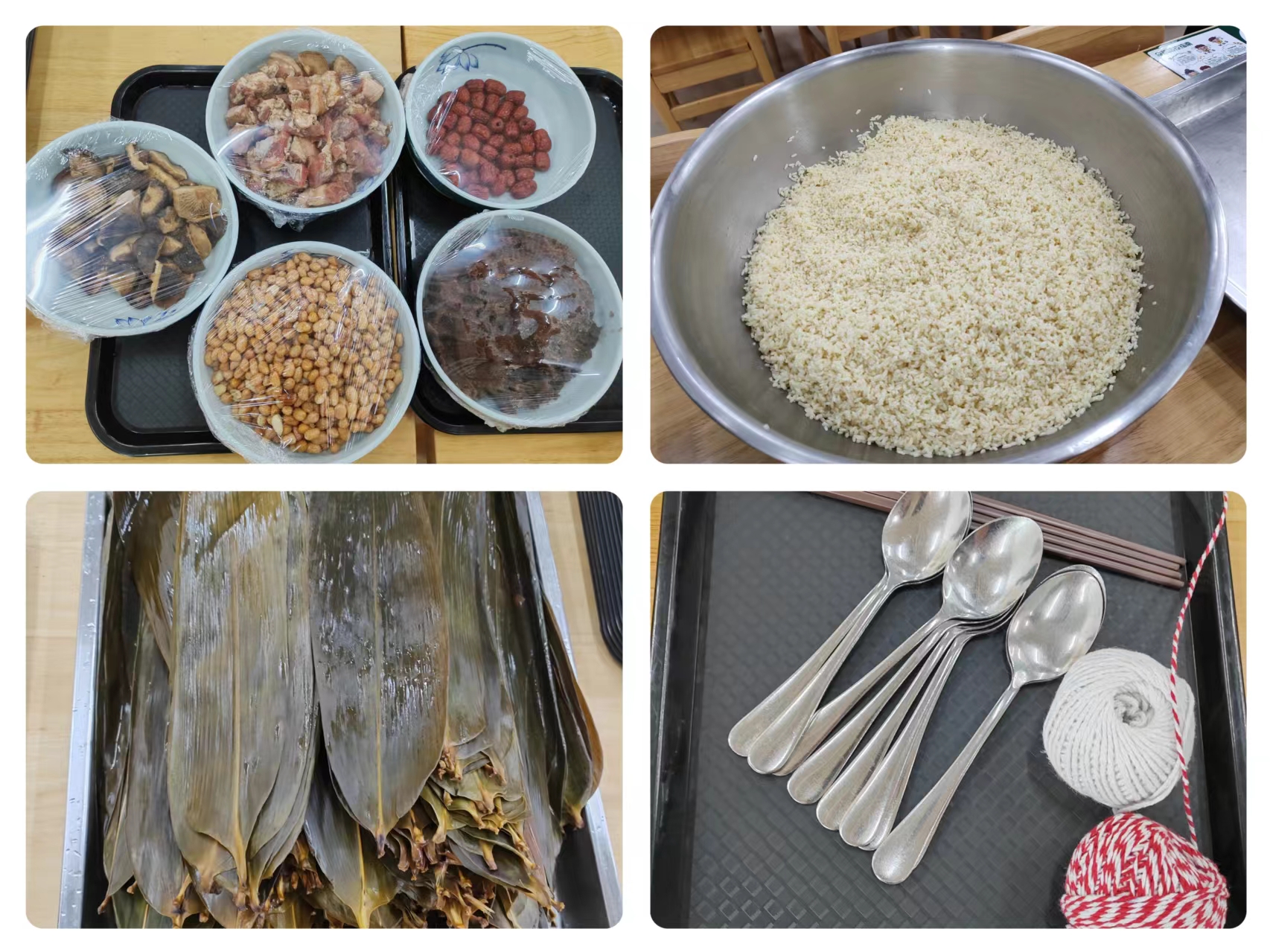 食堂师傅精心挑选了粽叶、糯米,以及豆沙和猪肉两种馅料,并讲授了包粽子的方法和技巧。