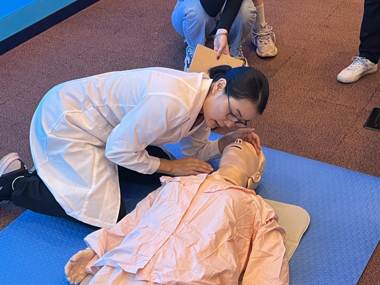 理论部分讲解完毕后,进入现场示范教学和实践操作练习环节。赵娟娟副教授进行动作要领示范。各组均配有学院提前准备的多种练习器具与模型,参加活动的部分师生进行了现场体验与实际操作。此外,学院的老师和学生志愿者为参加活动的部分师生进行了全程指导,保证了现场体验与实际操作的高效、准确和顺利进行。