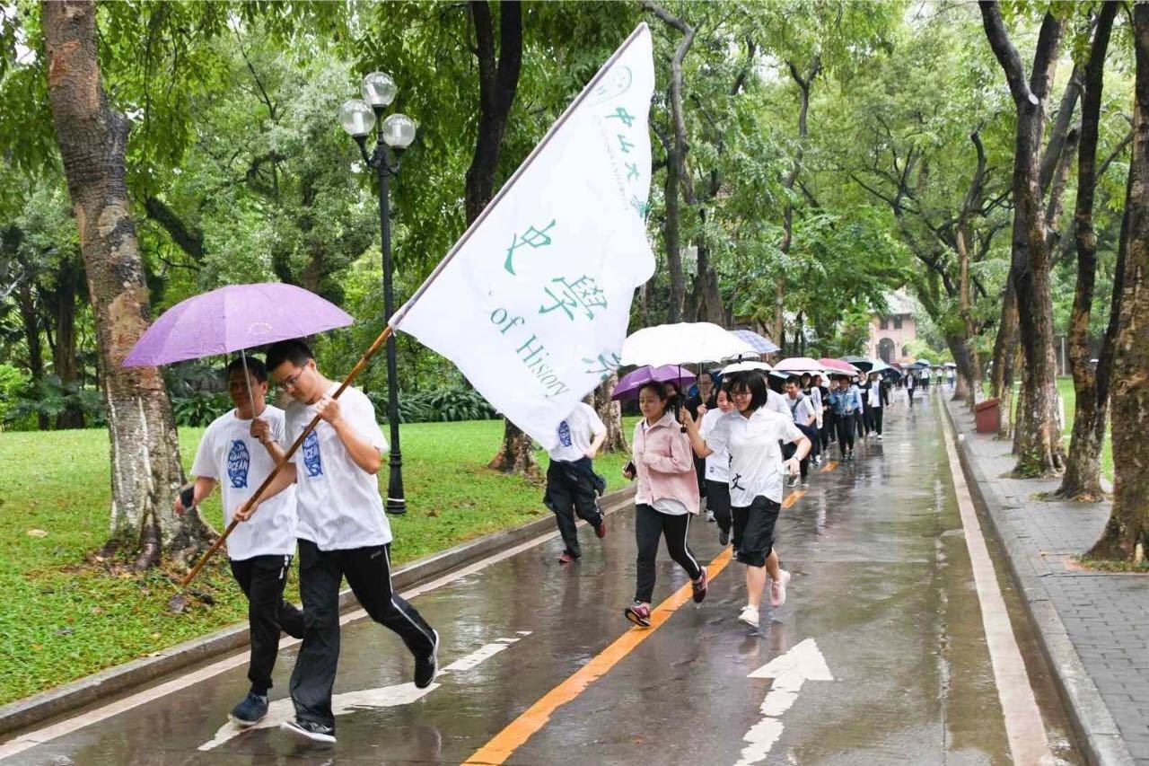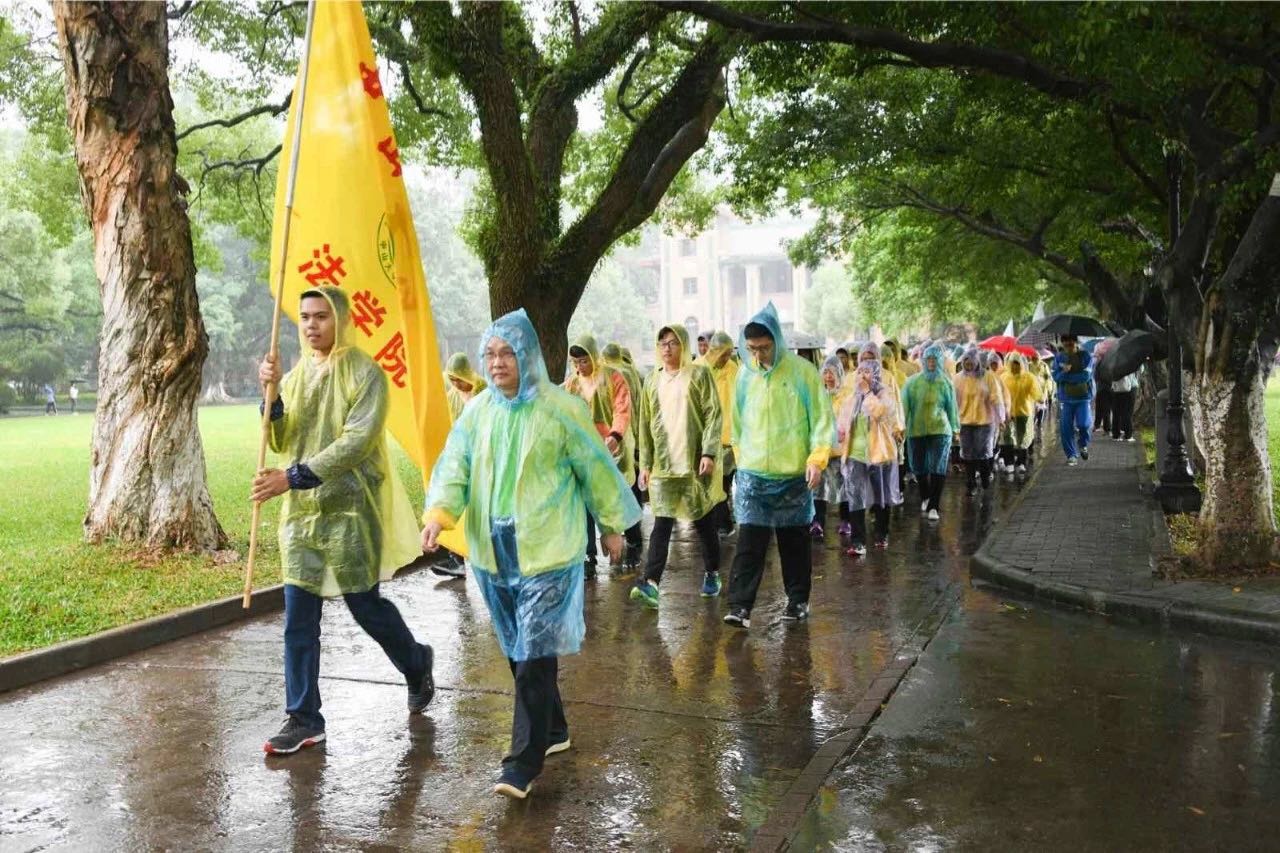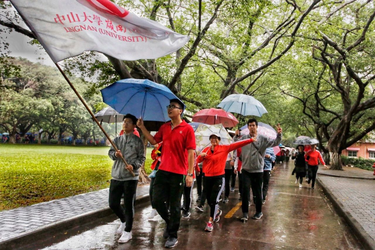 随后,发令枪声响起,宣告本次环校长跑正式开始。以校旗为首的各单位方阵依次出发,一个个彩色方队把校园装点得五彩缤纷。长跑队伍途经小礼堂、孙中山铜像、北门广场、马岗顶、园东区,最后到达英东体育场汇合,参加体育节开幕式。全体师生在雨中精神抖擞,昂扬向前,充分展现了中大人不畏艰难、健康蓬勃、积极向上的精神风貌。