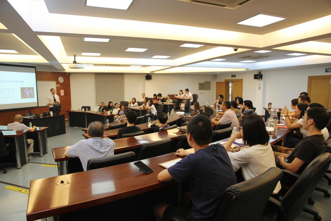 为关注办公室人员的脊柱健康,帮助教职工更好预防脊柱问题,6月7日,由校工会主办,附属第六医院工会、护理部、康复医学科承办,管理学院分工会协办的2018年校工会“精品活动”之“关注办公室人员的脊柱健康”讲座在善衡堂S221顺利举办。