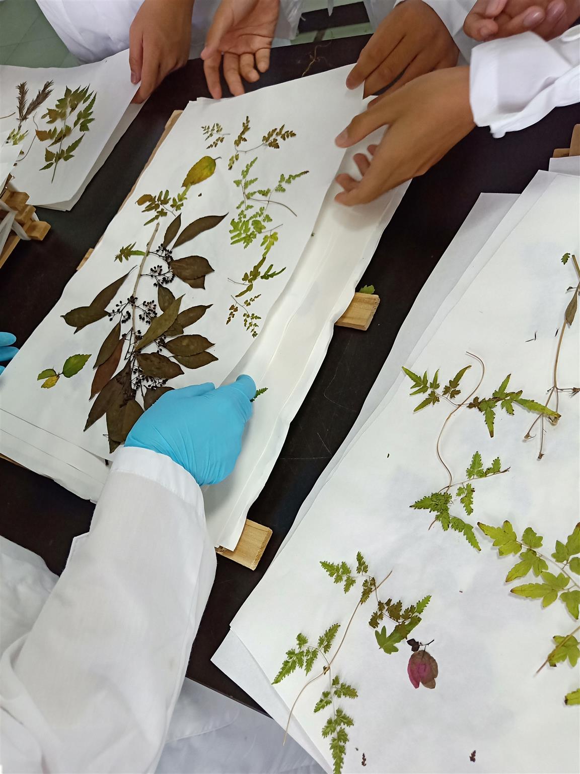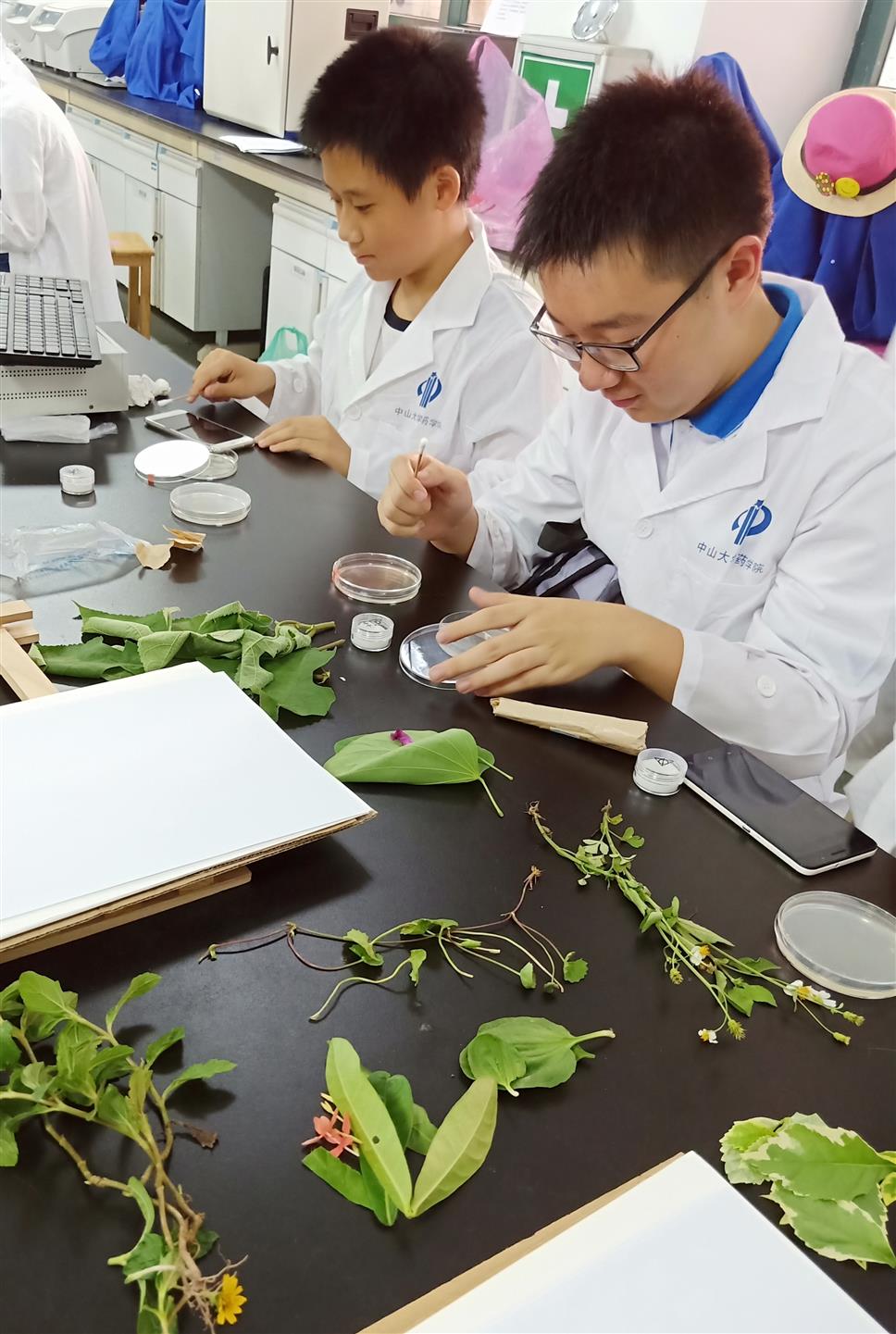 第二个实验是“药草总动员”。在这个实验中,参加的同学们在户外找到指定的植物后,再采摘叶片或花朵带回实验室自己动手制作标本。实验中,老师们对每一种植物的药用价值进行了介绍,激发了孩子们对生药学的初步认识和兴趣。在寻找目标植物的过程中,家长们带领孩子共同开展大自然之美的探索;在压制标本的过程中,孩子和家长又化身为艺术家,对标本进行再创作,共同开展艺术之旅,收获了不少漂亮的作品。