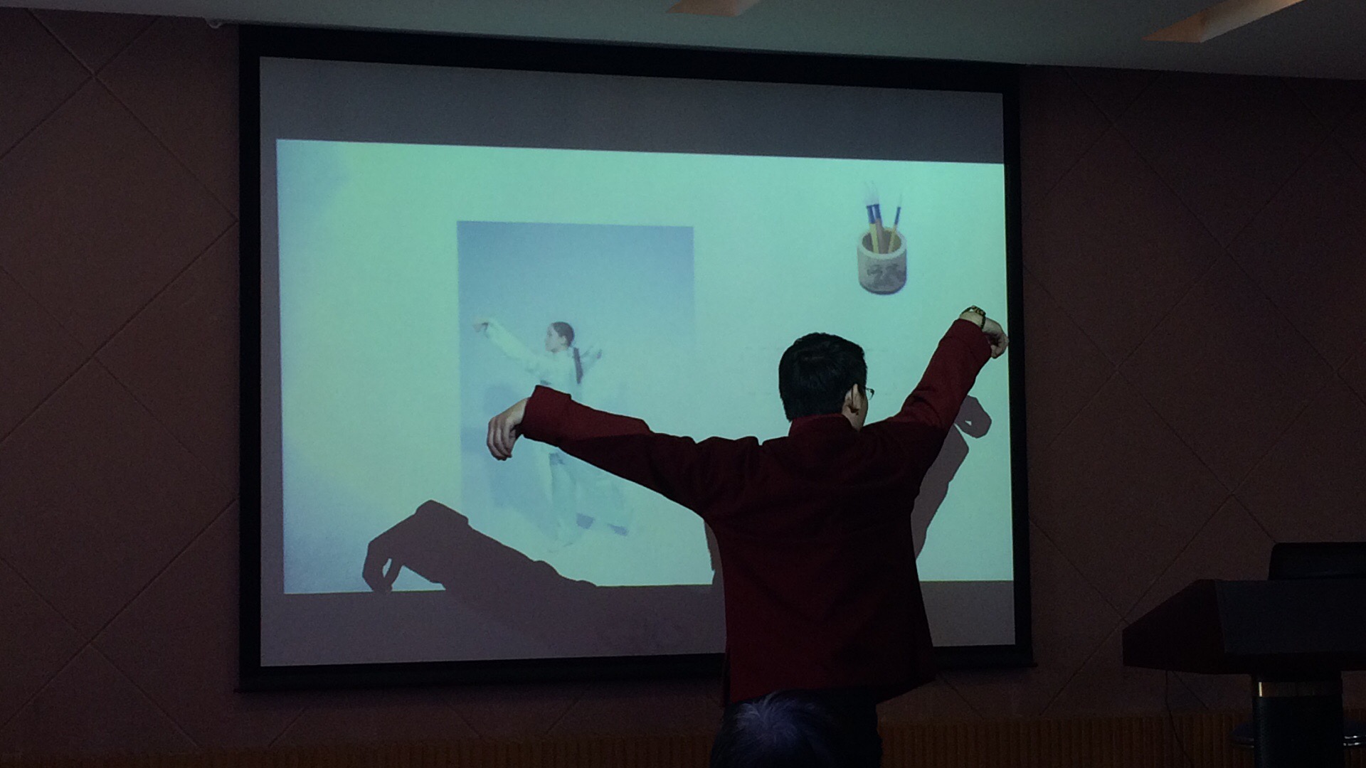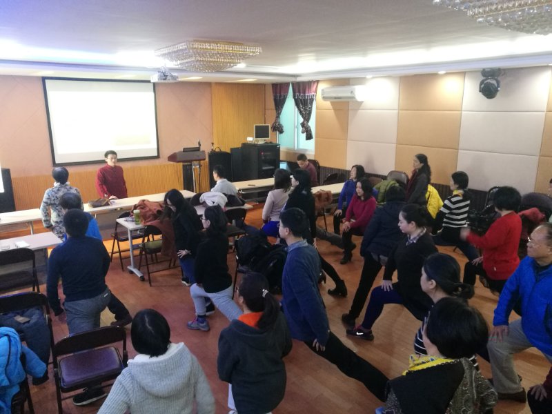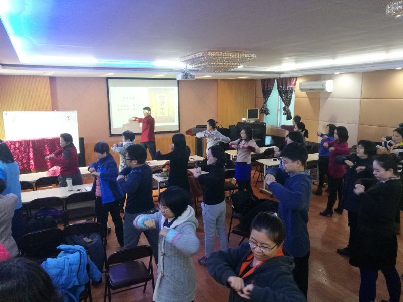本次讲座的主要内容为健康管理知识及“办公室养生五禽戏”功法讲解。“办公室养生五禽戏”是在神医华佗所编创的传统五禽戏基础上,通过对当代都市人,尤其是长期面对电脑,伏案工作的都市白领,因久坐办公室而引起的肩颈疼痛、“鼠标手”、“电脑眼”、紧张性头痛等一系列都市病进行归纳、梳理而总结出来的一套针对性强、不受场地限制的功法。康涛博士在讲解具体功法的同时,既融汇中国传统养生文化,又结合当代医学科学成果,既妙趣横生,又令人信服。身为太极拳世界冠军、广东省健身气功协会副秘书长的康博士所做的动作示范更是让在场听众啧啧称道,大家一招一式跟着练得热火朝天,顿时让这个寒风凛冽的冬日变得温暖如春。