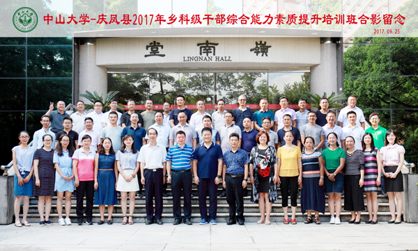 2017年第一期凤庆县干部综合素养与创新能力提升培训班于9月25日在我校广州校区南校园黄铭衍堂204室隆重开班。中山大学岭南学院党委书记黄山,工会副主席、扶贫工作组副组长彭志刚,中山大学管理学院党委副书记、凤庆县挂职副县长余立人,中共凤庆县委组织部副部长蒙盈等出席了开学典礼。来自我校定点帮扶的凤庆县44名乡科级干部们在美丽的康乐园展开为期5天的学习之旅。
