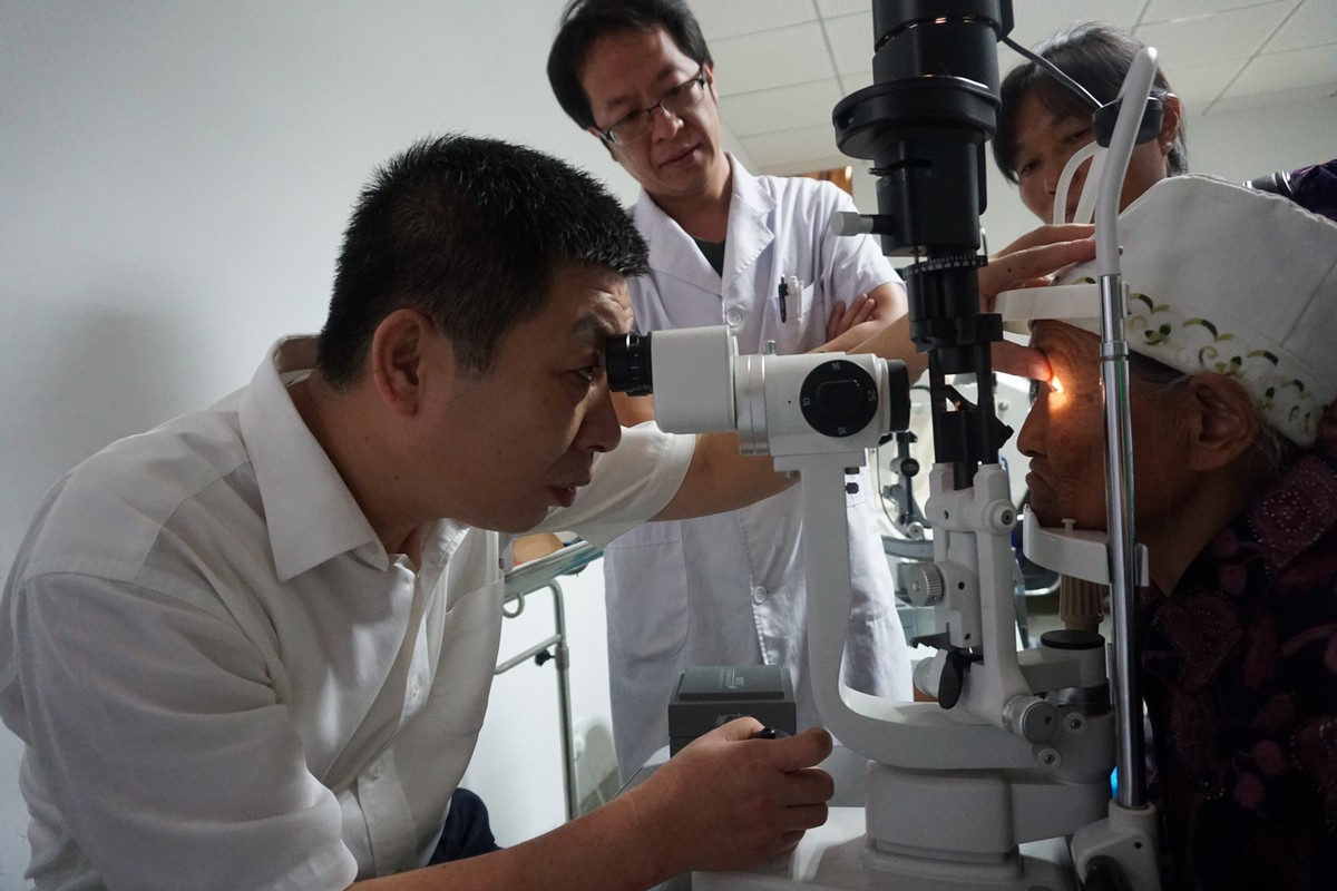 △ 余敏斌教授为患者检查眼睛