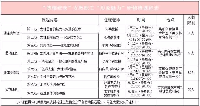 2017年5月10日至6月12日,由体育部直属部门工会承办的校工会2017年“精品活动”之“博雅修身”女教职工形象魅力工作坊在广州校区南校园共开设了九期课程,累计350人次参与。