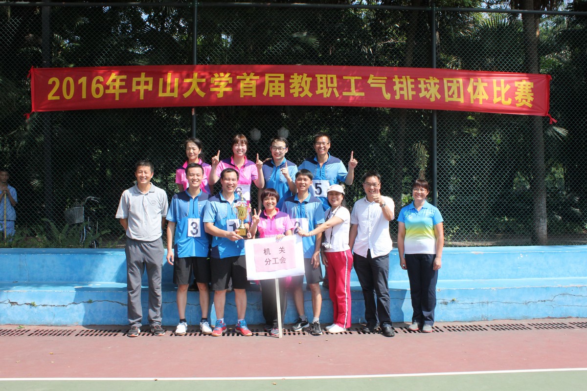 为活跃全校教职工文化生活,增强体质,由校工会、体育部主办,附属第一医院工会、珠海校区分工会协办的我校首届教职工气排球比赛于9月21日至10月15日在南校园、北校园和珠海校区展开,共有24支代表队参与角逐。经过前期激烈有序的预赛,共有8支参赛队伍进入10月15日在南校园举行的中山大学首届教职工气排球决赛。在决赛赛场上,参赛球员发扬团结协作、顽强拼搏的精神,以饱满的热情投入每一场比赛。经过龙争虎斗的较量,最终机关分工会和附属六院工会分别获得冠亚军。在闭幕式上,校工会副主席彭志刚对各单位的积极参与和配合、裁判员的公正裁决及比赛志愿者的辛勤服务表示衷心的感谢。校工会常务副主席吴京洪为参决赛的运动队颁奖。她表示,各参赛代表队发扬顽强拼搏、奋勇争先的精神,为我们呈现了一场场精彩的比赛,既全面展示了我校教职工的风采,又调动了广大体育爱好者的积极性,促进了我校全民健身运动健康、文明、有序的发展。