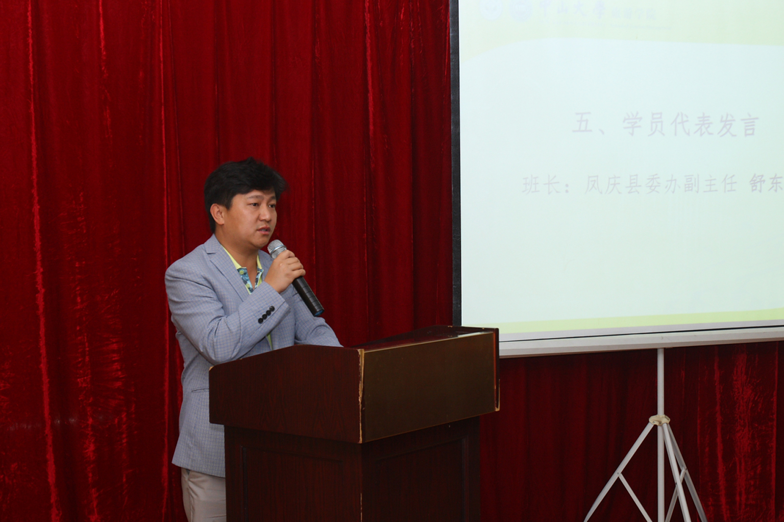 凤庆县委办副主任、培训班班长舒东平代表凤庆县县委县政府和52名学员向我校致以衷心的感谢,感谢中山大学自开展帮扶以来在旅游发展规划、人才队伍建设和医疗卫生等多个领域对凤庆的指导与帮助,感谢中山大学在博爱阅览室、二完小学教学楼以及凤庆书院的规划建设等多个项目倾注的大量心血,感谢中山大学领导、专家教授以及校友企业家带着感情、带着责任、带着对茶乡人民的真情厚意多次亲临凤庆开展定点帮扶考察工作。舒东平副主任表示,全体学员将严格遵守教学纪律,悉心聆听专家教授讲解,认真开展教学研讨,做到学有所思、学有所获。