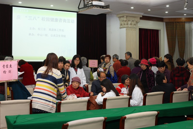 为庆祝“三八”妇女节,关爱教职工的身心健康,3月8日上午9:00-12:00,由校工会与离退休工作处主办、附属第一医院与公共卫生学院承办的校园健康咨询活动在南校区怀士堂顺利举行。附属第一医院妇科、中医科、内科、儿科、皮肤科等科室的医生现场义务接受咨询,护士与公共卫生学院的学生志愿者则现场为老师们免费提供骨密度检测、血糖血压测量与肩颈按摩服务。