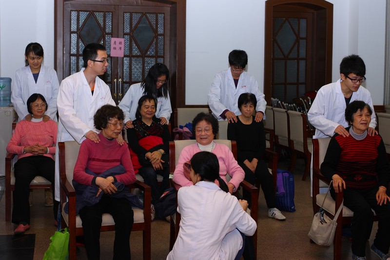 医生、护士与学生志愿者和老师们展开面对面的交流,悉心听取他们的咨询,耐心细致地进行专业的解答,不仅为大家提供了优质的服务,还根据测量的结果给予医疗保健方面的温馨提示。公共卫生学院负责肩颈按摩的学生志愿者们更是不辞辛苦,持续三个小时不停歇地为老师们进行肩颈按摩,帮助他们舒缓身体的不适。活动当天虽然下着淅淅沥沥的小雨,却丝毫不能减弱师生们参与的热情,每个项目前都排起了长龙,有的老师专程用婴儿车推着年幼的孩子来进行咨询,有的老师从校外赶来参加活动。