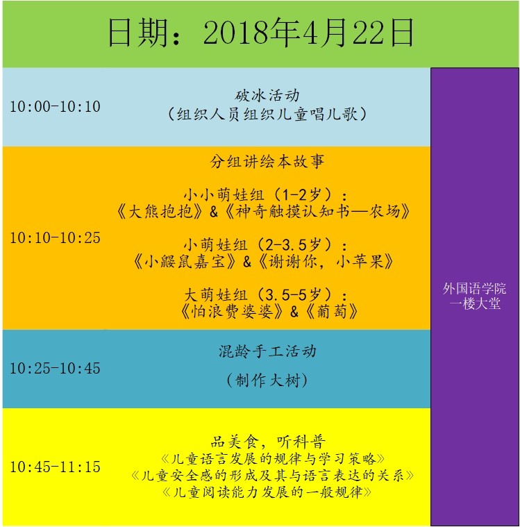 为了让孩子在父母陪伴、大学生领读、小伙伴共读的社交环境下体会绘本共读的乐趣并把保护环境的观念深植心中,同时鼓励中大本科生为孩子们讲故事说科普,根据中山大学校工会2018年“精品活动”立项安排,由外国语学院分工会承办的“世界地球日-绘本共读”亲子活动定于2018年4月22日(星期日)上午10:00-11:00在广州校区南校园外国语学院一楼大堂举行。现将有关事项通知如下: