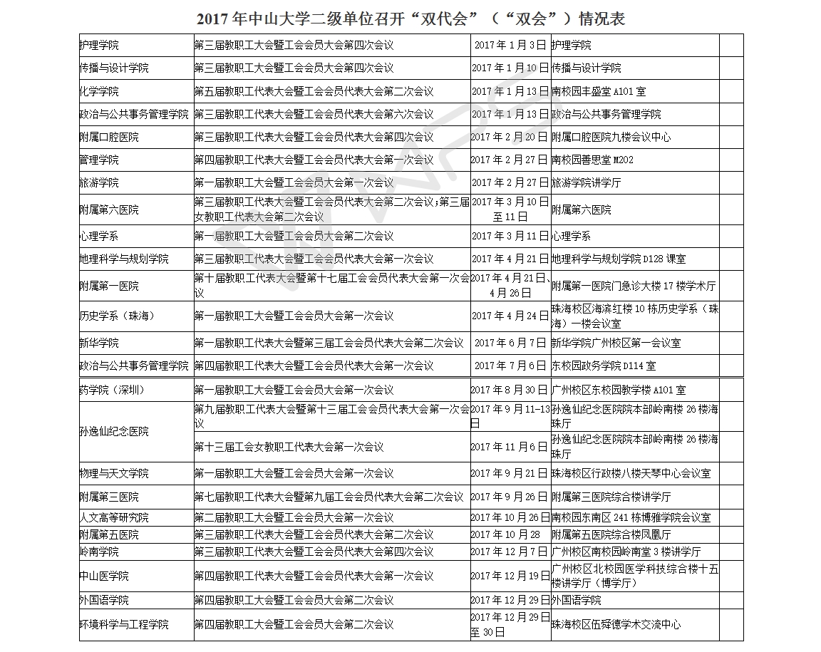 导航痕迹 首页 教代会 二级教代会 2017年中山大学二级单位召开“双代会”(“双会”)情况表 2017年中山大学二级单位召开“双代会”(“双会”)情况表 发布日期:2018-01-09 1 Share