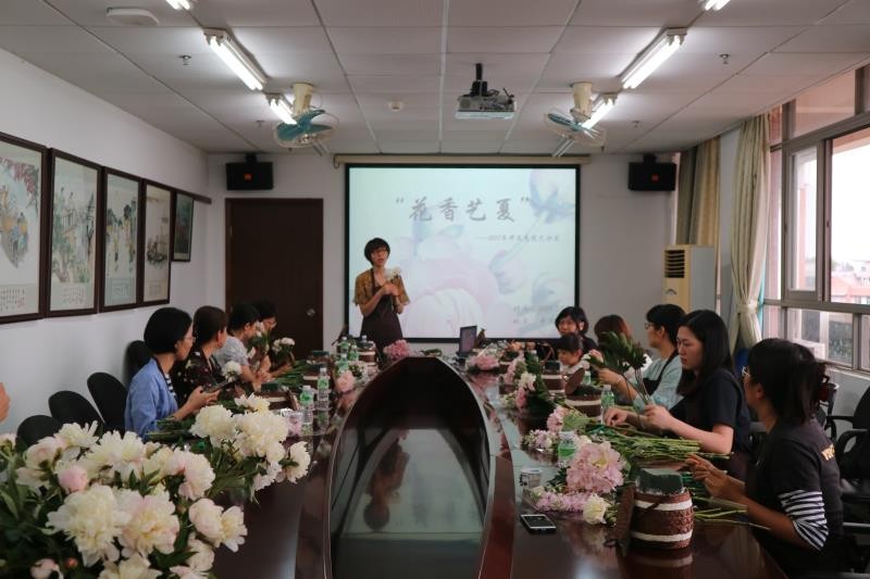 为丰富教职工文化生活,让大家体验插花乐趣,放松心情,装点生活,5月11日,中文系分工会在中文堂912室举行了主题为“花香艺夏”的花艺沙龙活动。中文系工会主席关键、校工会女教职工委员会委员郭冰茹等10余位老师参与活动。