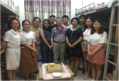 28号晚,黄新飞院长助理、翟爱梅副教授、李婷婷副教授、常笑博士、王链老师、李丽老师来到荔园15号和荔园18号看望新生们。王链老师事先邀请了8月份过生日的三位新生李纳、吴斌、李心稳一同前往。当老师和同学们敲开第一间宿舍的大门时,屋内黑着灯,只看到闪耀的生日蜡烛,听到欢快的生日祝福歌,老师和同学们在惊讶之余才知道今天学院为8月份过生日的黄新飞教授、李婷婷副教授、常笑博士和三位新生准备了生日惊喜。在明亮的烛光和欢快的歌声中,老师和同学们激动而开心,表示很惊喜能在开学第一天收到了学院温暖的礼物与温馨的祝福。大家一同品尝着美味的蛋糕,分享着生日的喜悦。