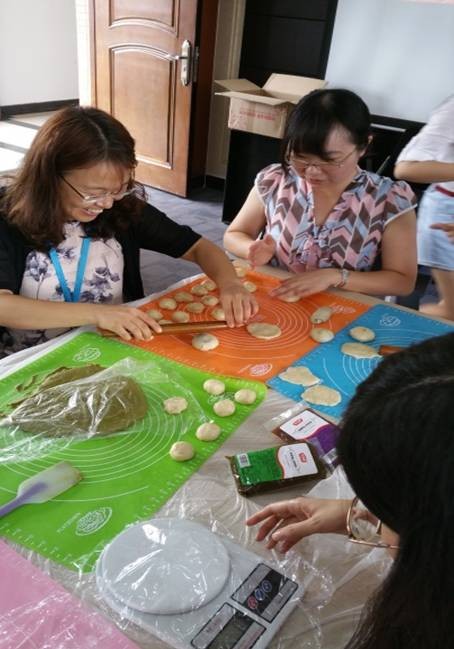 从和面、揉面,到包馅、印模、烘焙,再到最后包装,每一个步骤都由教职工自己动手完成。经过紧张的四小时,大家一共制作出两百多枚月饼,种类有:蛋黄抹茶酥皮月饼、桃山皮月饼和冰皮月饼。