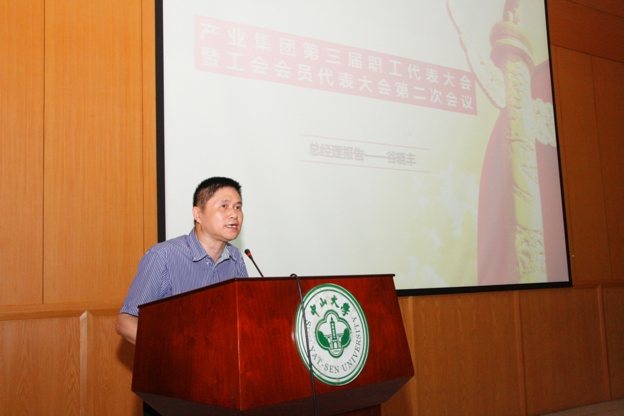 集团总经理、党委书记谷晓丰向大会作产业集团(中大控股)经营情况通报。他主要说了五部分:一是2014年度及2015年上半年中大控股的整体经营情况; 二是高校校办企业面临较为紧张的大环境,是挑战更是机遇;三是学校对中大控股新的发展定位与要求;四是持续加强党风廉政建设、扎实推进三严三实教育; 五是与会代表应担当支持企业发展、维护员工权益的责任。他介绍了中大控股2014年主要经营指标情况及重点工作情况,他指出集团需要重新思考定位中大与中大控股的关系,中大控股的贡献与价值,借中大控股制定“十三五”规划之机,进一步理清中大控股未来的发展路径。谷晓丰总经理还传达了学校党委郑德涛书记在产业集团专项检查整改暨党风廉政建设班子会议上的指示,希望各位代表要有主人翁意识,担当起监督企业规范廉洁的责任。最后,他指出各位代表是企业的主人,希望大家心中有责,敢于担当,善于担当,秉承着善待、严管的精神,以大局为重,担当起持续支持企业发展、维护员工权益的重要责任。