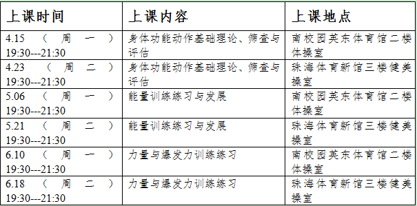 从4月15日开始共6次培训课程,广州南校园、珠海校区轮流上课。培训内容包括身体功能动作基础理论、筛查与评估、身体功能性动作训练指导等,凡参加训练者均建立一份运动健康档案,并建立活动微信群,老师将在线上辅导及发布动作视频。