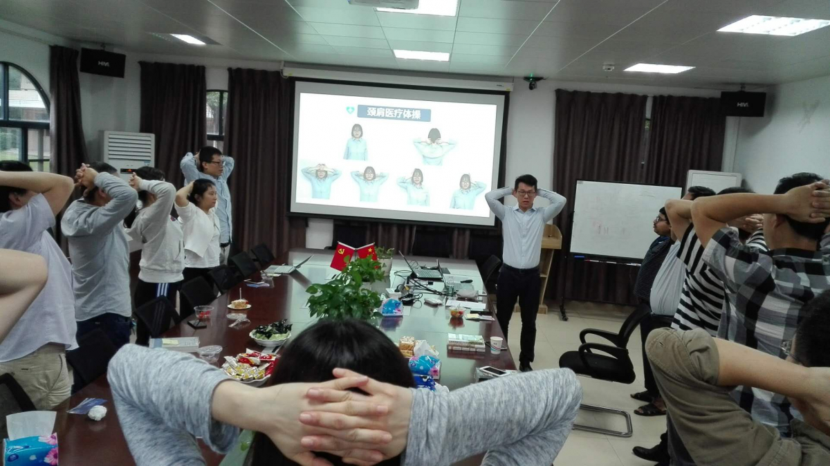 “日常做好自我保健是关键”,张医生一再强调。颈椎疼会引发头部、肩部等不舒适,一旦疼痛,可以通过按摩肩颈处的风池穴、肩井穴和天宗穴三个穴位来缓解相应部位疼痛。为了让现场老师们直观感受,他让大家两人一组相互找穴位,他边示范边指导如何找穴位、如何按摩。之后带领大家现场做了5分钟颈肩医疗体操,张医生建议老师们每天抽空做做,可以预防颈椎病或缓解颈椎不适。现场老师们积极响应,认真按照张医生的示范做每个动作。一套医疗体操做完,大家都表示自己的颈肩感觉舒服多了,讲座干货满满,自己受益匪浅。