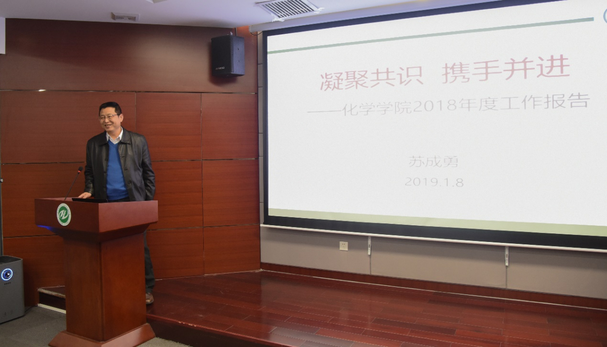 2019年1月8日下午,化学学院第五届教职工代表大会暨工会会员代表大会第四次会议于丰盛堂A403举行。化学学院院长苏成勇、党委书记陈文波、分工会主席祝方明及50余名代表出席大会。大会由分工会副主席张艺主持。