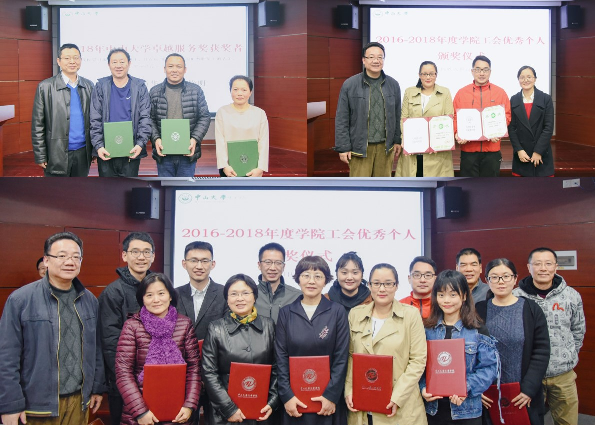 苏成勇院长、祝方明主席、林莉莉副主席分别为获得中山大学卓越服务奖、2016-2018年度学院工会优秀个人进行颁奖。卓越服务奖已设立10年,是对在中山大学累计服务 30 年以上,且在职期间工作无瑕疵教职员工的表彰。学院2018年度获该奖项者为童叶翔、黄华珍、黄艳明;陈洪燕、柳思扬荣获2016-2018年度学院“优秀工会工作者”;共24位教职工荣获2016-2018年度学院“工会积极分子”。