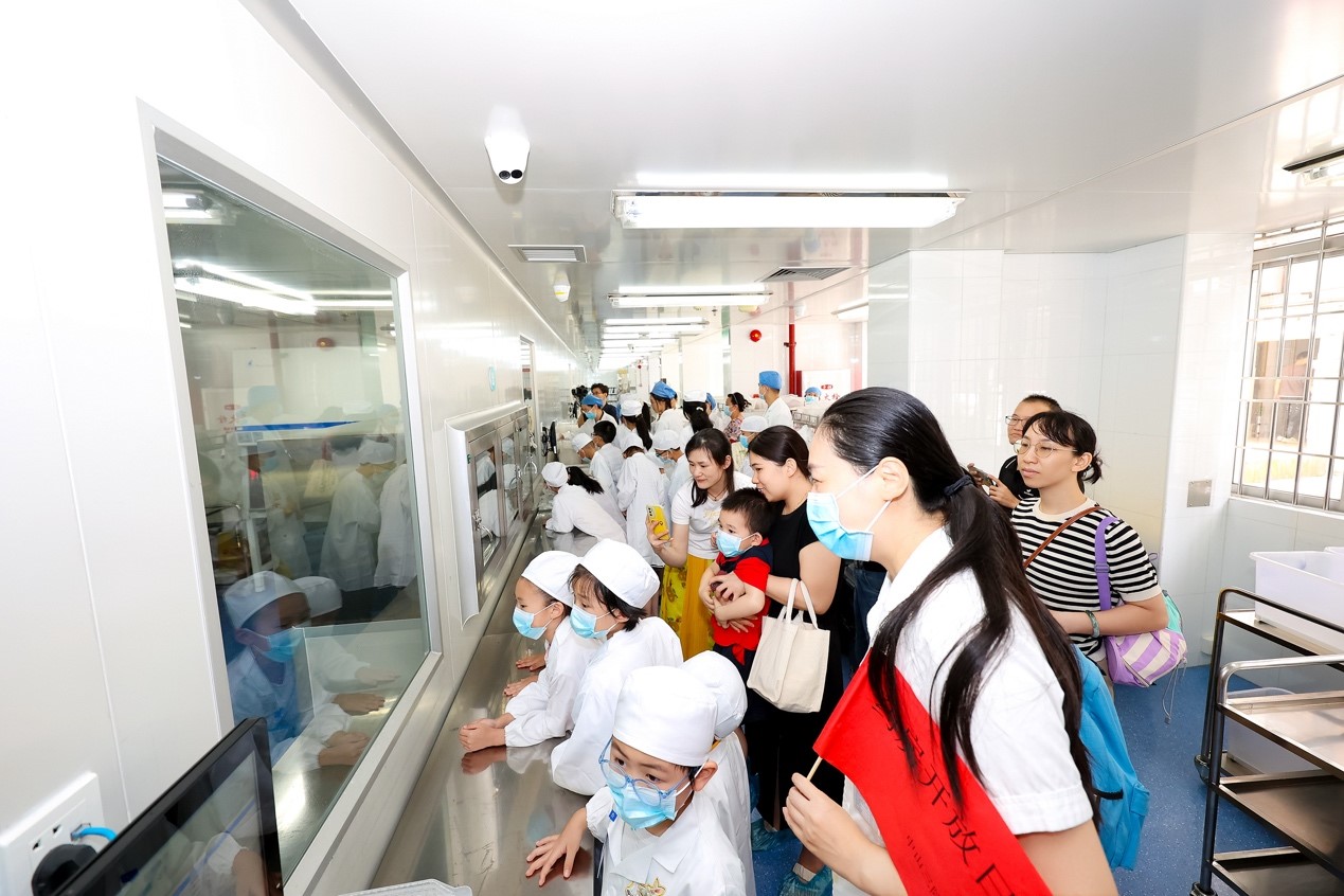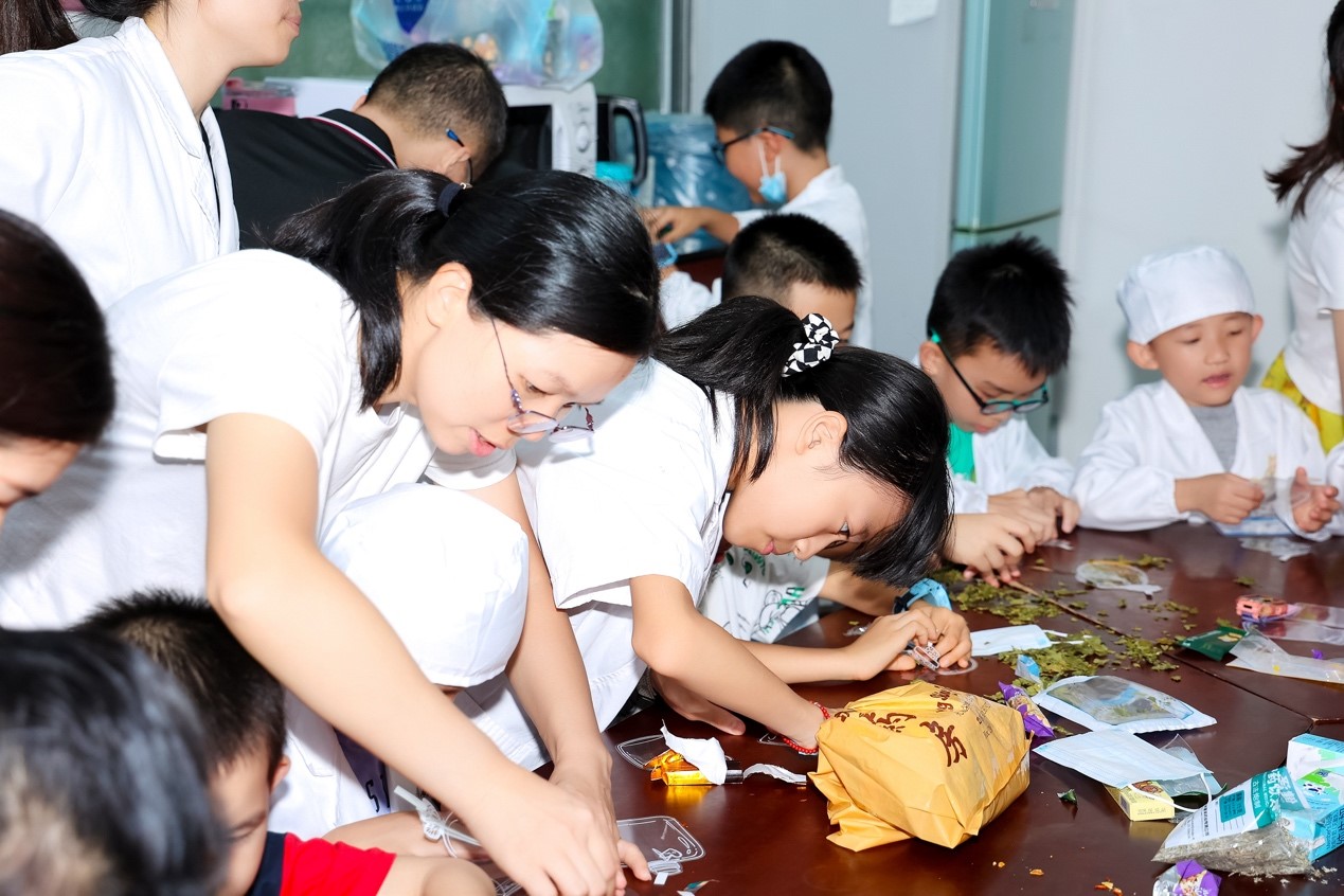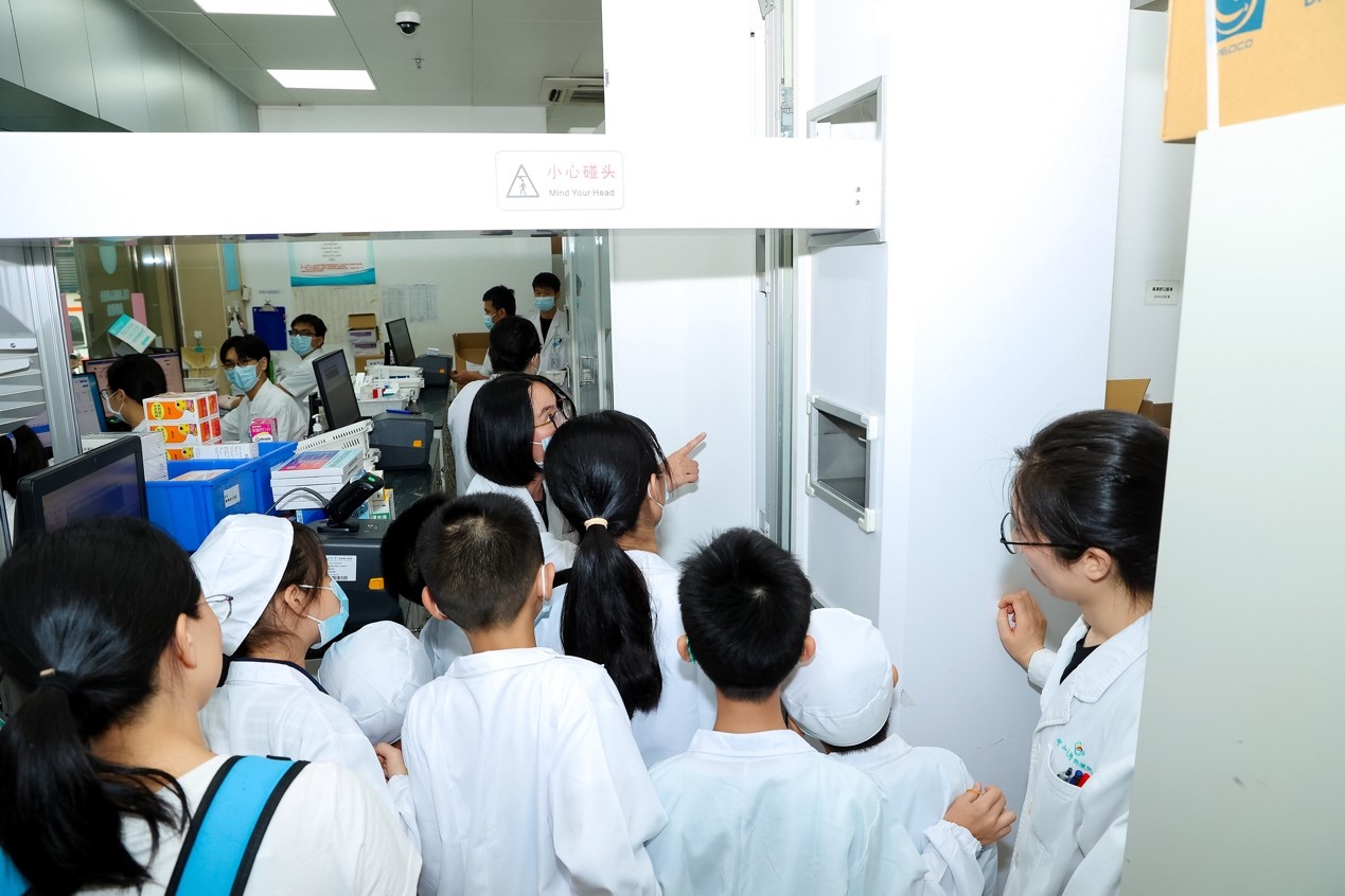 旅程第一站来到静配中心。静配中心组长为他们讲解部门的运作流程,展示如何配置静脉输液,以及贴签机器的使用。小朋友们看见穿着防护服的药师在洁净仓内配药,都充满了好奇。