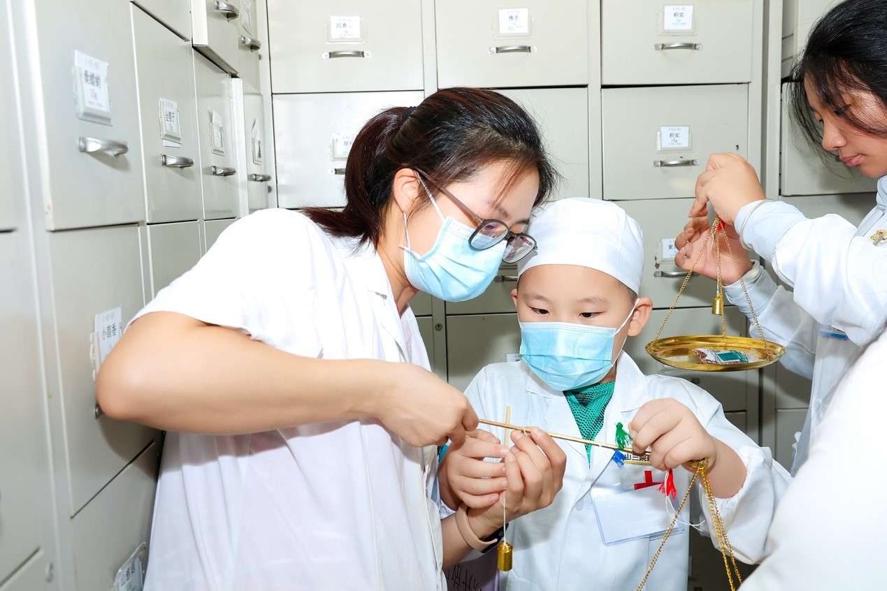 旅程第三站来到中药房,学习中药的基本知识和传统用药文化。中药房组长准备了日常生活中常见的中药材,通过看、闻、摸等方式,加深小朋友们对中药材的印象。更有小朋友忍不住尝了一口准备的山楂片。中药房还准备了戥称,教他们如何使用戥称称量中药材。