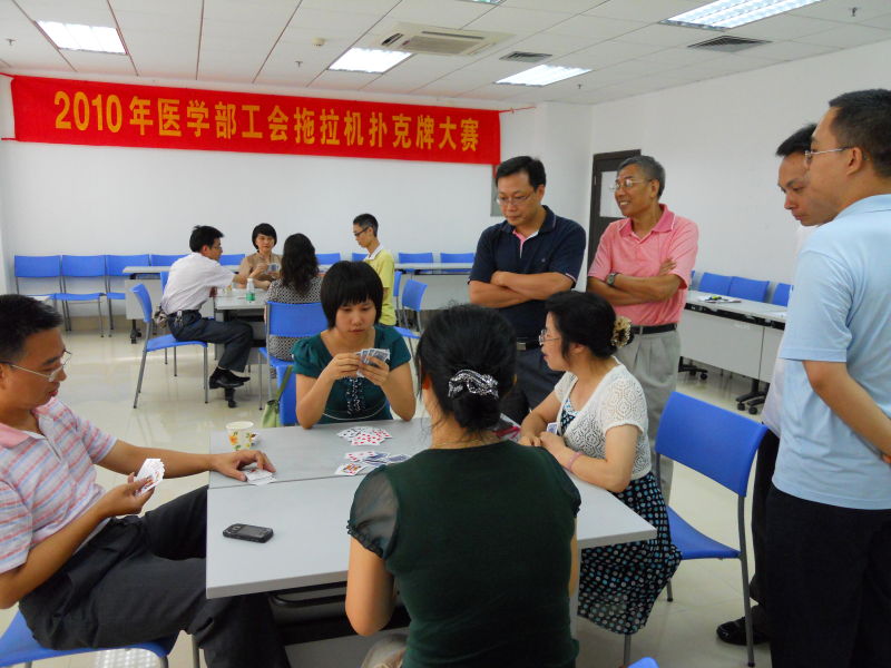 7月15日下午一点,医学部分工会职工拖拉机扑克牌大赛准时开幕。本次大赛以工会小组为单位,由医学部办公室、医管处、医教处、医科处及实验动物中心各派代表组队参加。比赛进行时,恰遇北校区停电,酷热难当,然而队员们的热情与室温一样高涨,头脑却始终清醒而冷静,各自使出浑身解数,各显神通,斗智斗勇,共演一场场精彩非常的比赛。有遥遥领先轻松胜出者,有拉锯苦战握手言和者,有出师不利反击成功者,赛况之激烈直教旁观者叹为观止。欢声一片中,时间悄然滑过,最后医学部办公室凭着难得的配合、出色的发挥以及上好的运气大获全胜。这一活动休闲健脑,既舒缓了平日紧张工作所带来的疲劳和压力,又营造了轻松、温馨、和谐的氛围;不仅丰富了工会活动的形式,还促进各处室之间的联系和交流,效果可见一斑。