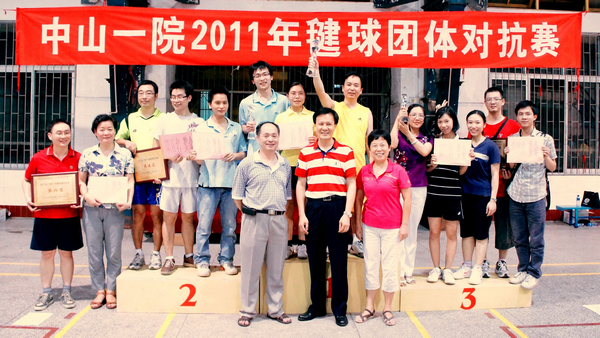 9月15日晚上,为全力提高医务人员身体素质,搭建好各部门沟通交流的桥梁,由院工会主办的“附属一院2011年毽球团体赛”在北校区体育馆精彩上演。本次比赛以部门工会为单位进行,总共有23支代表队184名职工参加了比赛。由于毽球团体赛在我院是第一次举办,各参赛队伍都非常重视,组织队员利用业余时间进行训练。参赛运动员们在球场上各显神通,大展身手,精彩的表现获得在场观众的阵阵喝彩。经过两个晚上的激烈角逐,黄埔院区工会荣获第一名,急诊科工会荣获第二名,行政工会荣获第三名,药学部工会荣获第四名,放射科工会荣获第五名,医务处工会荣获第六名。校工会兼职副主席、越秀区人大代表、附属一院副院长肖海鹏为上述获奖团队颁奖。